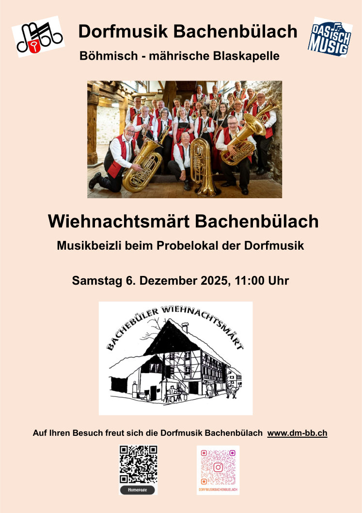 Samstag, 06.12.2025 11:00 Uhr | Bachebüler Wiehnachtsmärt Musig-Beizli im Sprützehüsli Bachenbülach | |